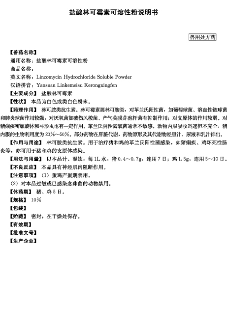 用于巴氏桿菌和大腸桿菌所致的細(xì)菌性疾病。