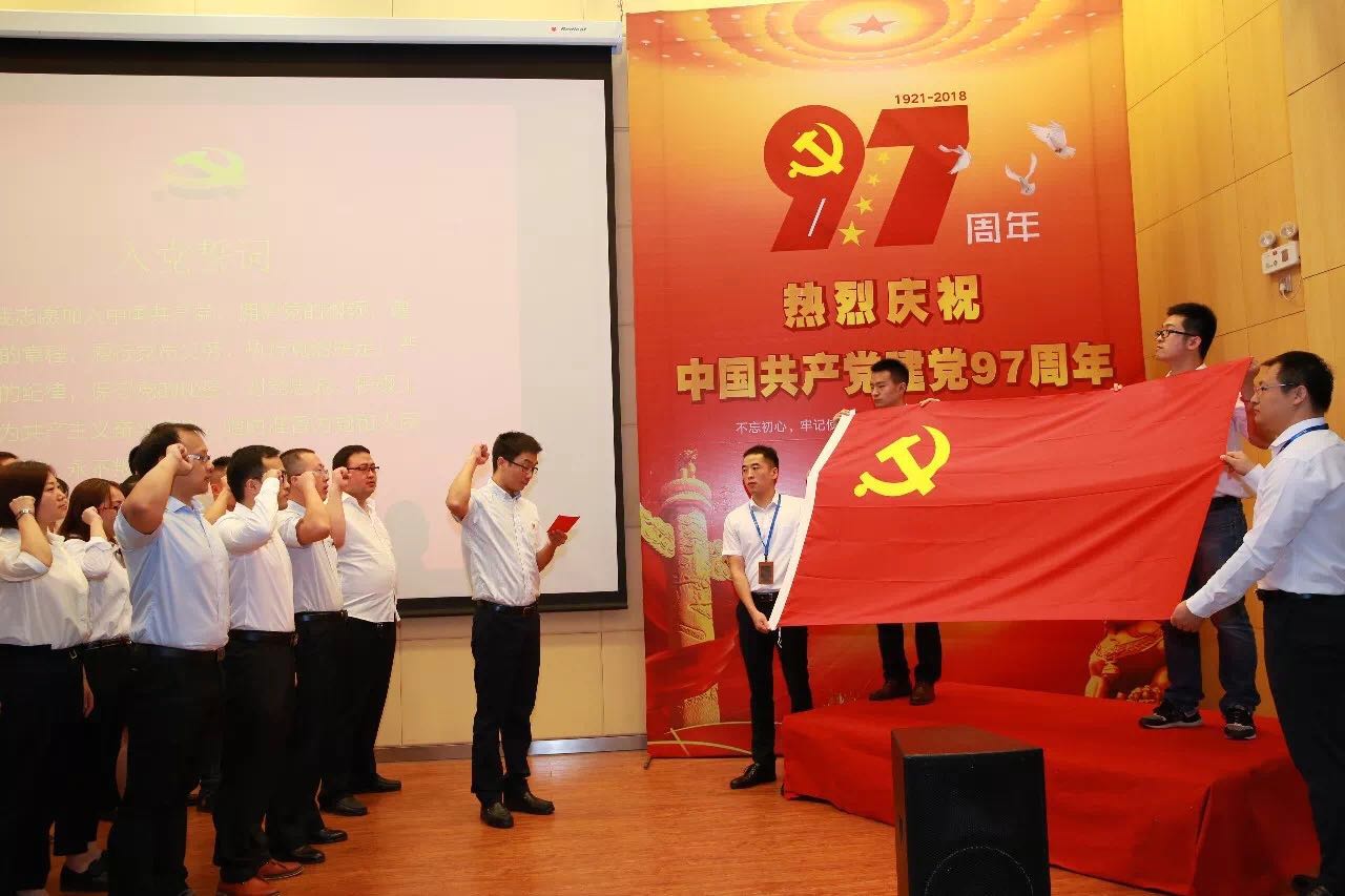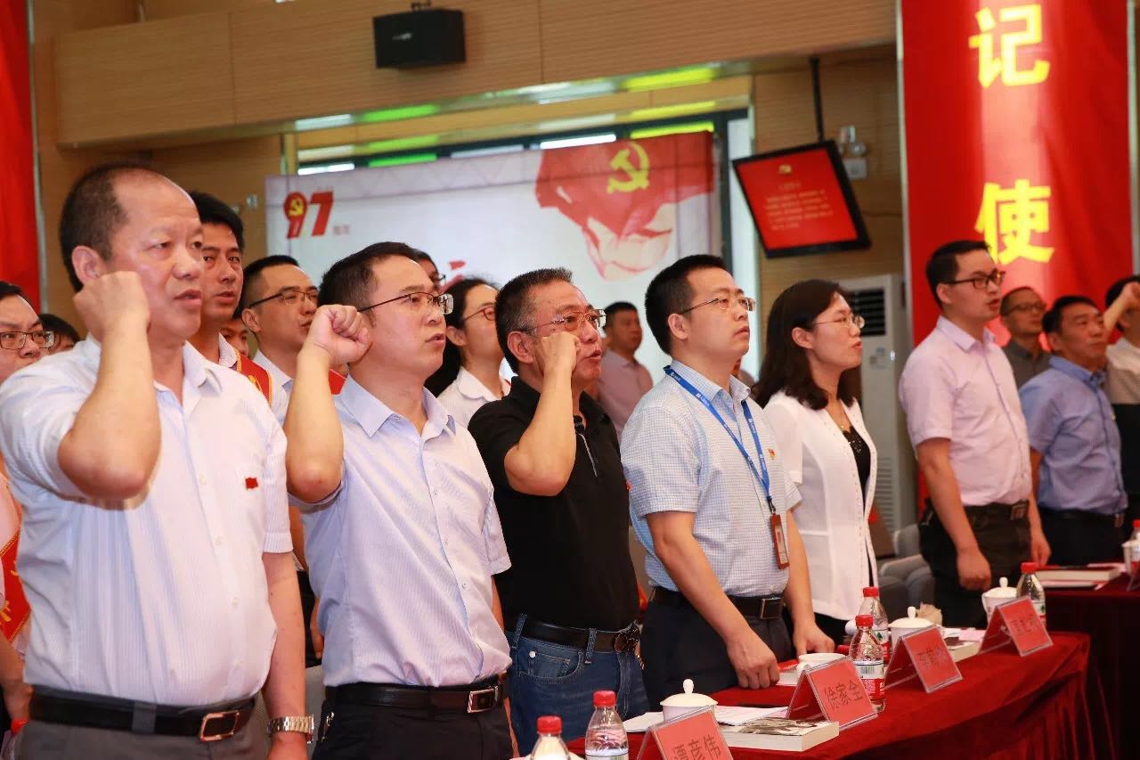 在莊嚴、肅穆的入黨宣誓儀式中,在鮮紅的黨旗前,大會舉行新黨員入黨宣誓儀式,臺下全體黨員重溫入黨誓詞。