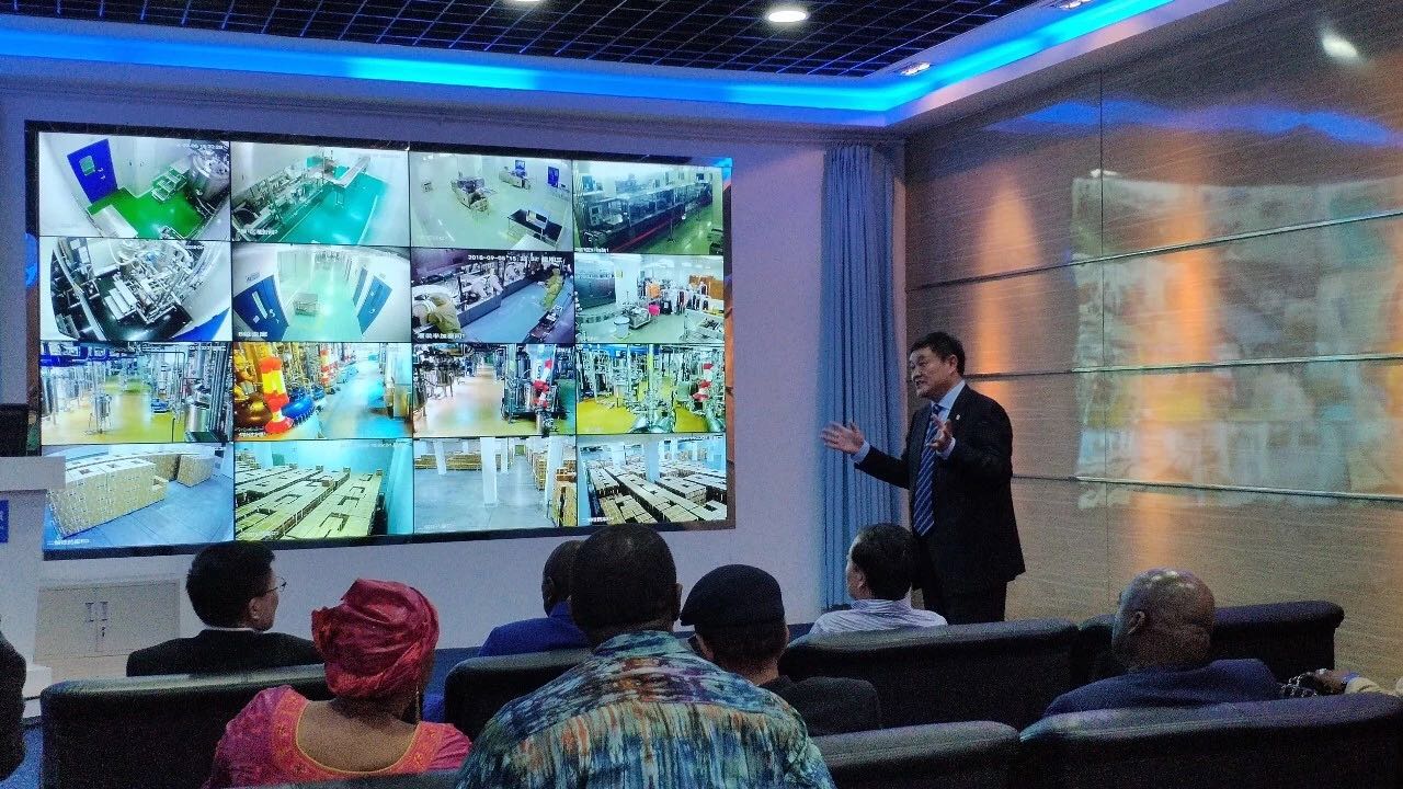 ? ? ? ? 隨后,孔戴總統(tǒng)還觀看了覆蓋廠區(qū)各角落、生產(chǎn)全過程的安全監(jiān)控系統(tǒng),對全自動生產(chǎn)設(shè)備、高科技作業(yè)流程表示驚嘆。李杰總裁自豪地介紹,公司所有的高精尖設(shè)備,都是中國自主研發(fā)的,在非洲兩個工廠的設(shè)備也是“中國智造”??状鼽c頭表示贊許,并希望將來能將這些高端的技術(shù)、設(shè)備和人才引入本國。李杰董事長指著全球戰(zhàn)略地圖上的幾內(nèi)亞說,希望下次再見總統(tǒng),這片區(qū)域的燈也亮起來了。孔戴發(fā)出爽朗的笑聲。參觀結(jié)束后,公司領(lǐng)導(dǎo)與孔戴代表團(tuán)合影留念。? ?