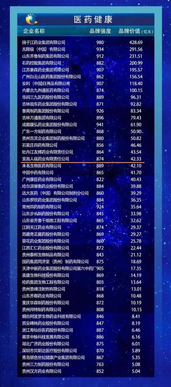 ? ? ? ?2019年5月9日,由新華社、經(jīng)濟日報社、中國國際貿(mào)易促進委員會、中國品牌建設(shè)促進會、中國資產(chǎn)評估協(xié)會等單位聯(lián)合舉辦的“2019中國品牌價值評價信息發(fā)布”活動在上海舉行。在此次發(fā)布會上,醫(yī)藥健康板塊共49個品牌上榜,宜昌人福藥業(yè)公司品牌價值位居第18位,品牌強度為874,品牌價值42.33億元,較2018年的評估價值40.27億元有了進一步提升。